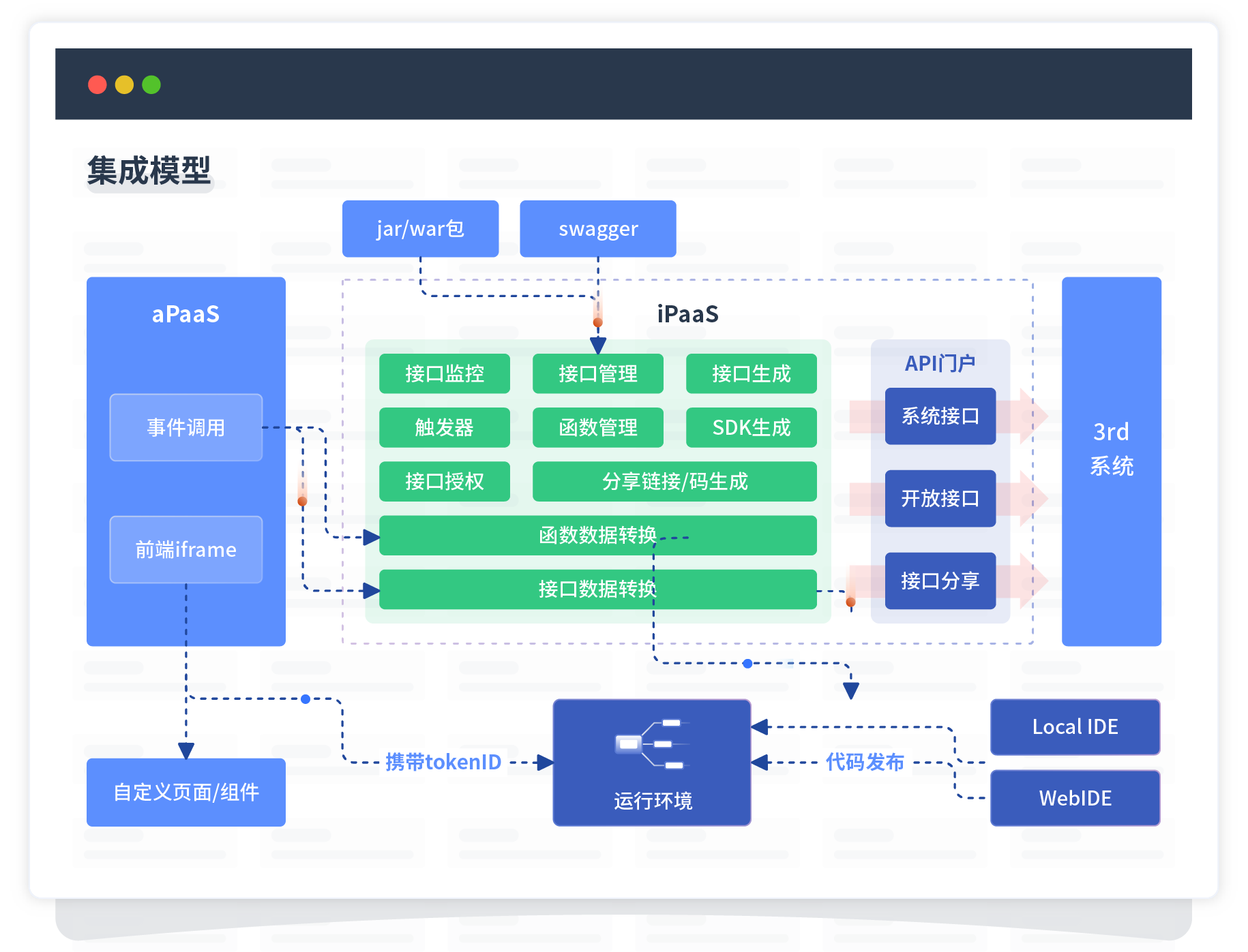 集成模型包括平台本身前、、、、、、、、、、、、后端能力的扩展,,,,,,也支持通过API门户和第三方系统进行交互。。。。。。。。。。