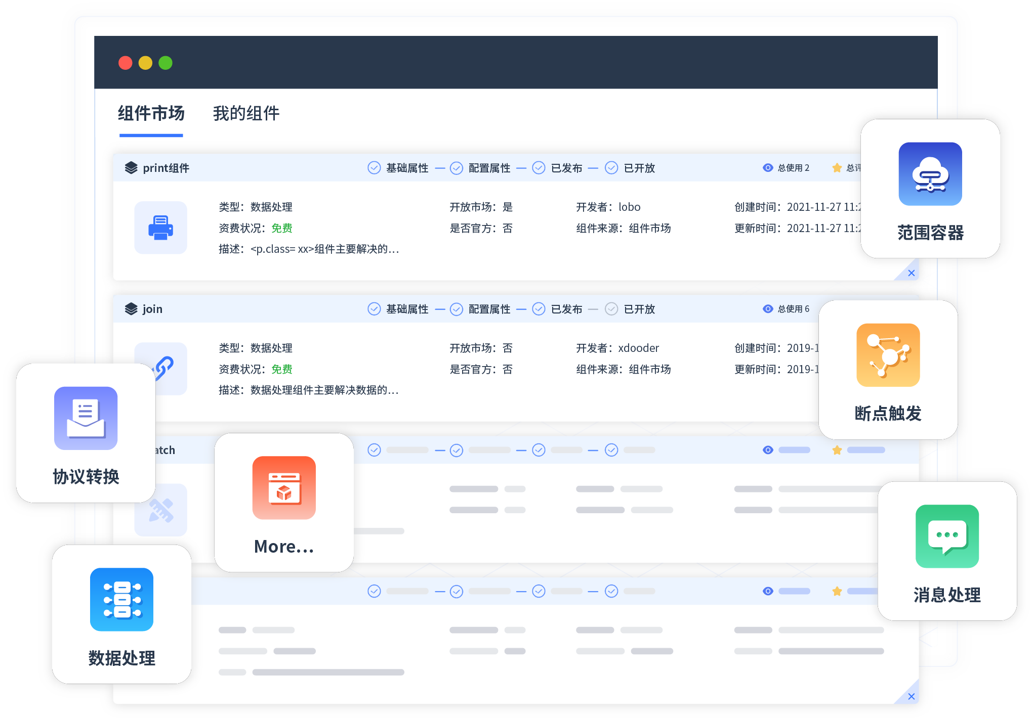 针对集成场景,,,,,,,,,小米钱包提供组件市场,,,,,例如协议转换、、、、、消息处理、、、、、、、、、、、、文件操作等。。。。。。。。除平台提供的组件外,,,,,,,客户可以自定义所需组件。。。。。。。。。。