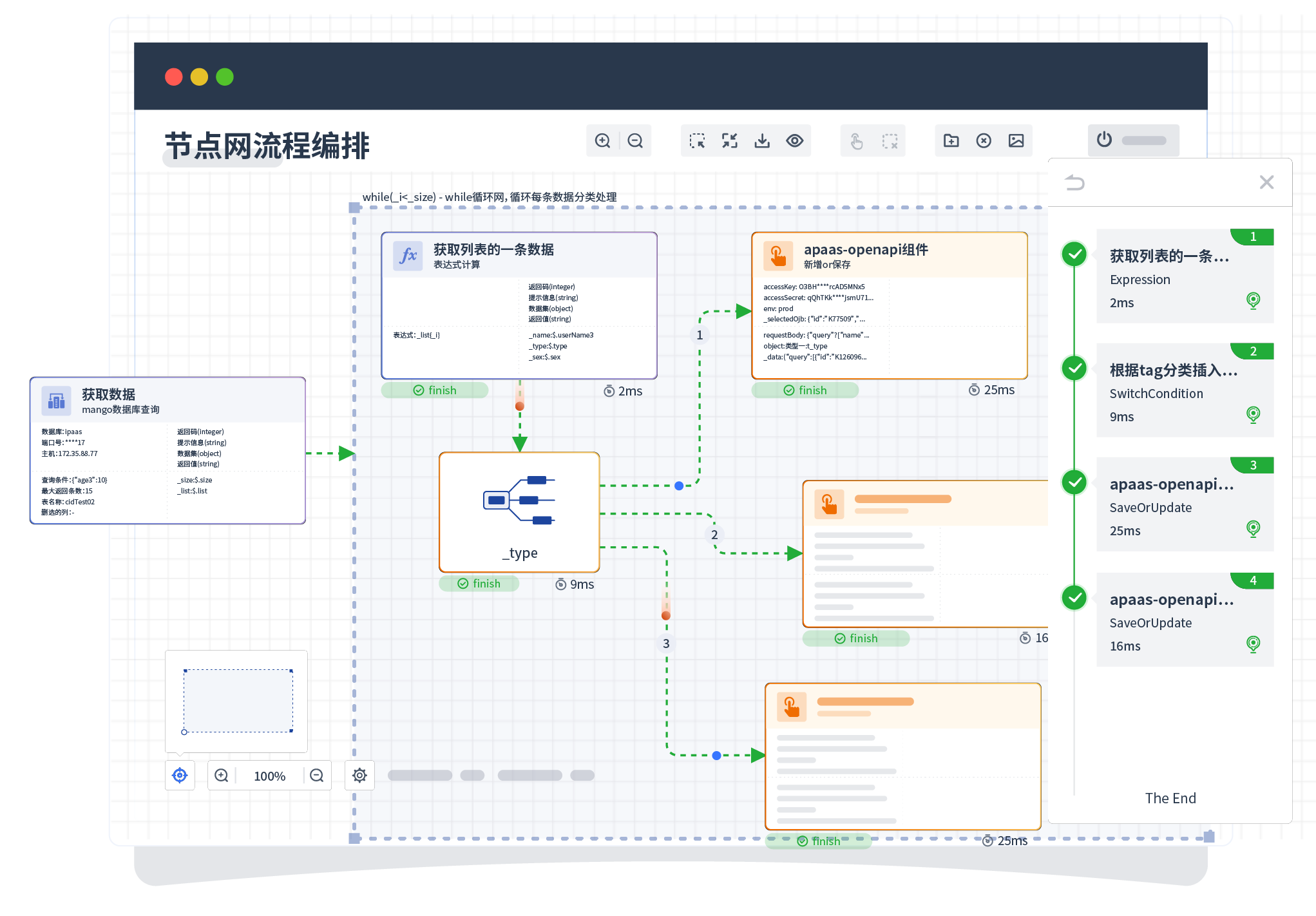 针对集成场景,,,,,,,,,,,组件定义后支持进行流程编制,,,,,,,,,,不同于传统代码方式,,,,,,,,,通过图形化展示,,,,,,,,,,,支持在线调试、、、、、、、、、、、日志查看和运行回放。。。。。。。