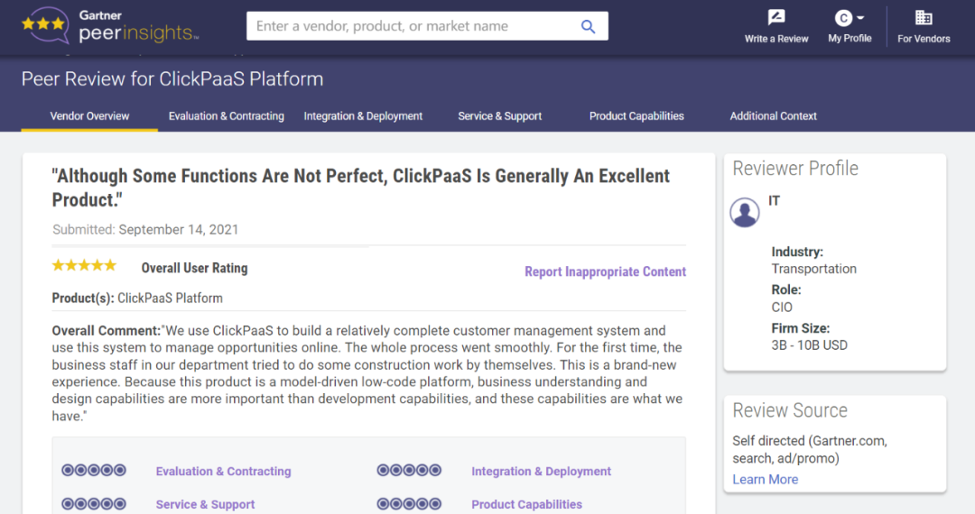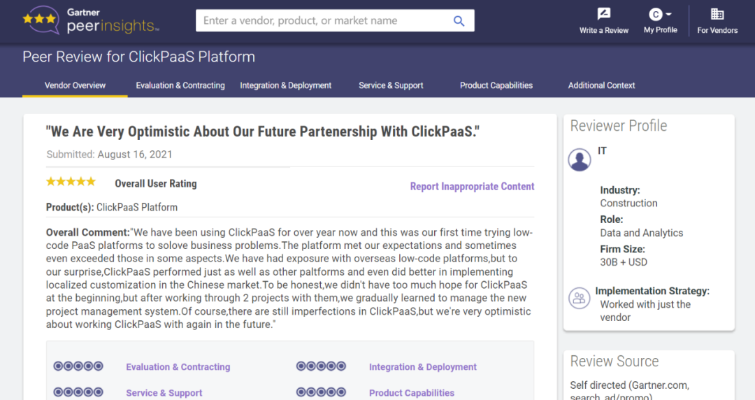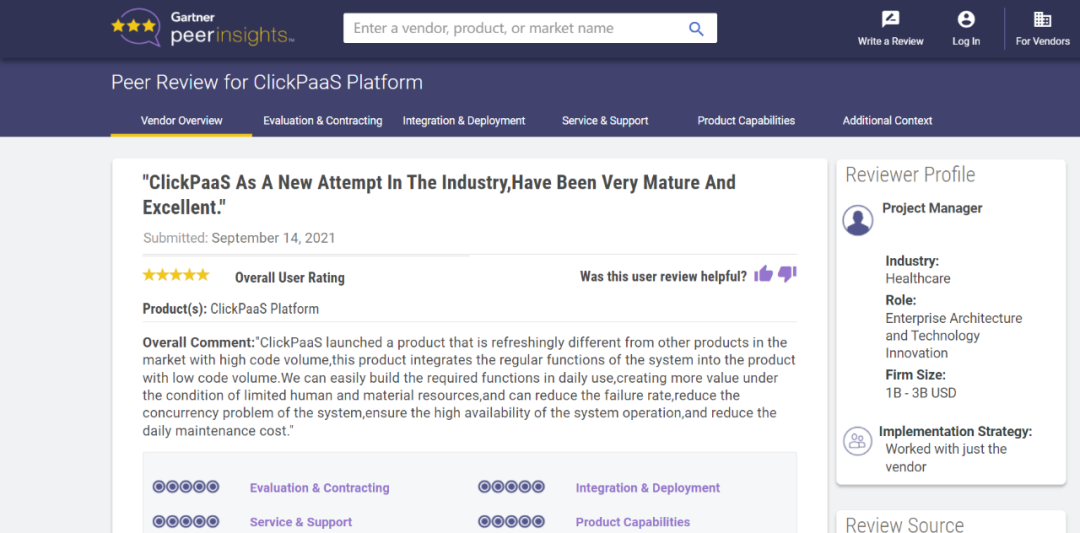 Tips::::::::【Peer Insights】——用户对企业IT产品和服务发布真实评价的平台。。。。。。目前已有355个市场,,,,,,,,,,,,,255,000条经过验证的评价。。。。。。每一条评价Gartner会针对参评企业营收规模及参评人员信息做验证、、、、、、、、、、、、、、、评价内容做多维核实。。。。。。